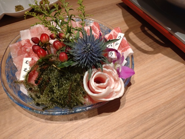 海ぶどうに肉を巻いて食べると塩気が出てきてなかなかにおいしい。