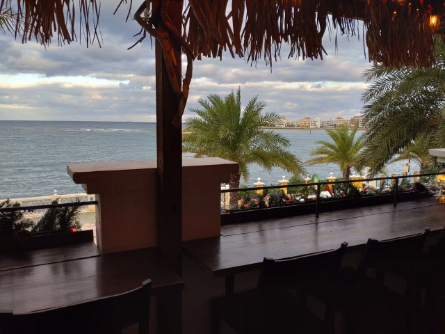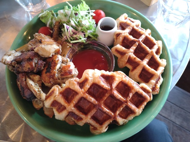 朝食もアメリカンビレッジで海の見えるカフェでワッフルとチキン。