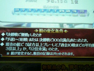 現在の組で5試合以上プレーして、「過去10戦までの平均順位が12位未満」のとき